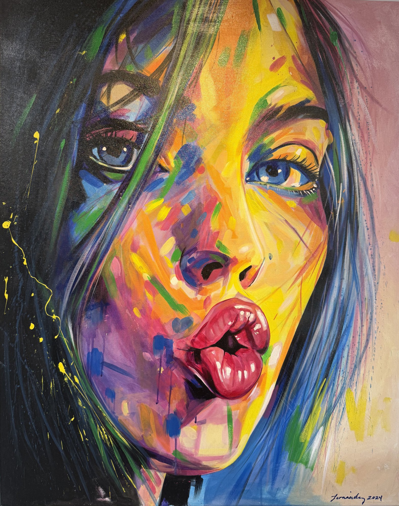 Dielo zo série ORISHAS. Dielo vyžaruje čistú radosť života a hravú ženskú energiu. Dynamické farebné vrstvy na tvári pôsobia ako fragmenty emócií, skúseností a identity, ktoré sa spájajú do jedinečného výrazu mladosti a slobody. Pohľad postavy je sebavedomý, živý a plný vitality, zatiaľ čo výrazné pery zdôrazňujú zmyselnosť a spontánnosť okamihu. Kompozícia prepája kontrasty medzi svetlom a farbou, čím vytvára dojem pohybu a neustálej premeny. Obraz pôsobí dynamicky je plný energie, ktorá pulzuje z plátna. Dielo nesie symboliku Ajé – hravej ženskosti, ktorá predstavuje životnú energiu, tvorivosť a prirodzenú vitalitu. Obraz tak stelesňuje mladú ženskú identitu v jej najčistejšej forme: hravú, slobodnú, sebavedomú a plnú života. Obraz je vytvoreny na laňovom plátne , bol profesionalne natiahnutý na rám . AJÉ Oil painting on canvas 81 × 101 cm 2025