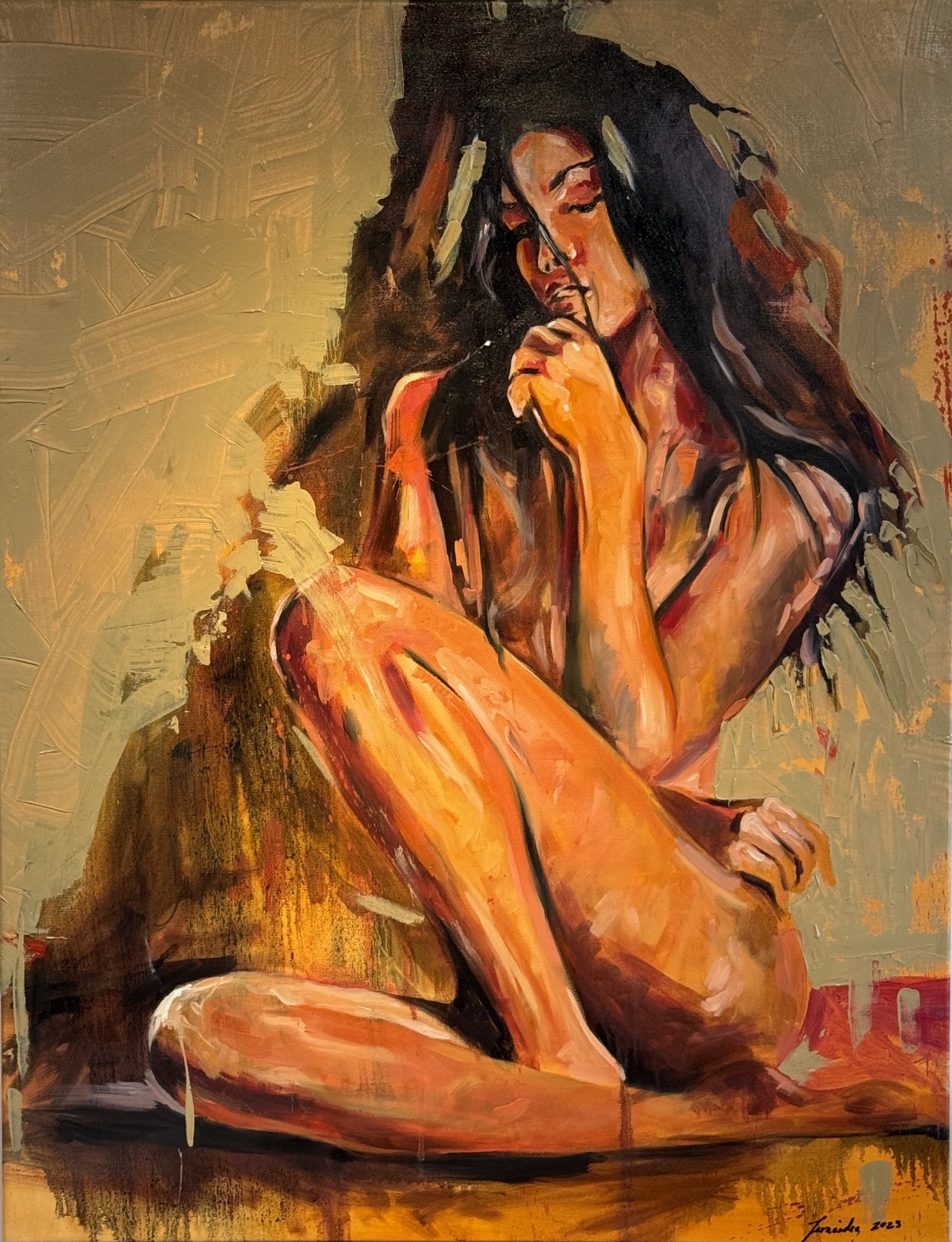 Dielo zo série ORISHAS. Tento Akt zachytáva intímny moment ženy ponorenej do vlastného vnútorného sveta. Jej telo spočíva nízko, takmer splýva so zemou, akoby sa vracala k svojej podstate. V tejto polohe žena vníma neidealizovanú, ľudskú pravdu. ONILẸ, orisha zeme a prirodzenosti, symbolizuje spojenie s realitou bytia. Postava pôsobí unavene, uzavreto, no zároveň nesie tichú dôstojnosť a krásu, ktorá nevyžaduje pozornosť. Je to moment zastavenia – medzi tým, čo bolo, a tým, čo ešte len príde. Farebnosť diela osciluje medzi teplými zemskými tónmi a fragmentmi svetla, ktoré naznačujú nádej a vnútorný pohyb. Žena nie je zlomená – je v procese. V procese prijatia, uvedomenia a tichej transformácie. Obraz je vytvoreny na laňovom plátne , bol profesionalne natiahnutý na rám . Oya Oil painting on canvas 79 × 102 cm 2025